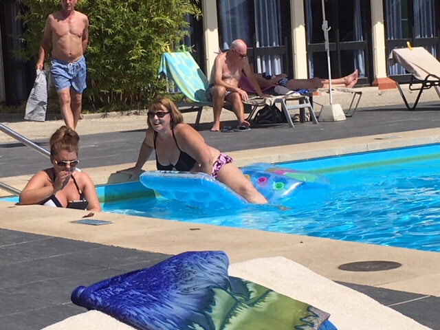 Our last full day has been spent by the pool which pleased the sun worshippers. Lots of LILO frolics in the pool this afternoon and Foxy has nearly learnt you stay on the LILO and not under it.