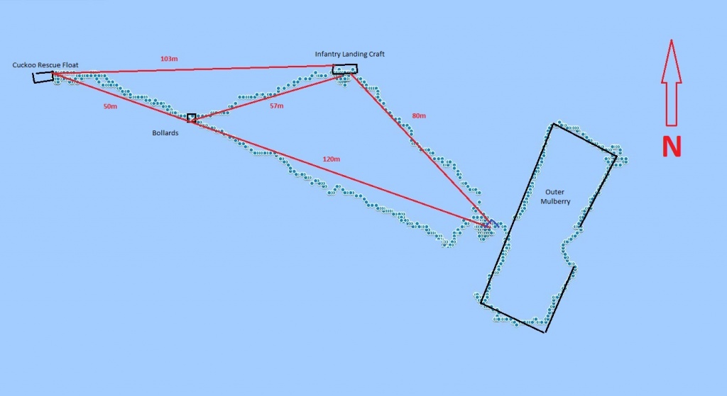 It is possible to visit the Outer Mulberry, Landing Craft and Cuckoo during a single dive. Many years ago, a trail made up of rope lines between each object was established by the Wittering Divers Club, however over time the lines have become disconnected or lost and the trail broken.