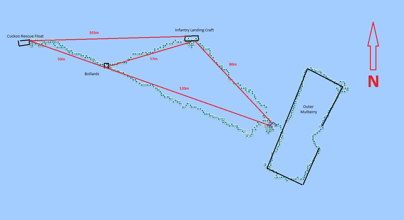 Another rope on the port side of the Cuckoo (not shown in the picture above) leads back to the pair of Bollards and then back to the Mulberry. The course is 109 degrees (M) and the distances are 50 metres to the Bollards and then another 120 metres to the Outer Mulberry thus the total distance from the Cuckoo to the Mulberry is around 170 metres.